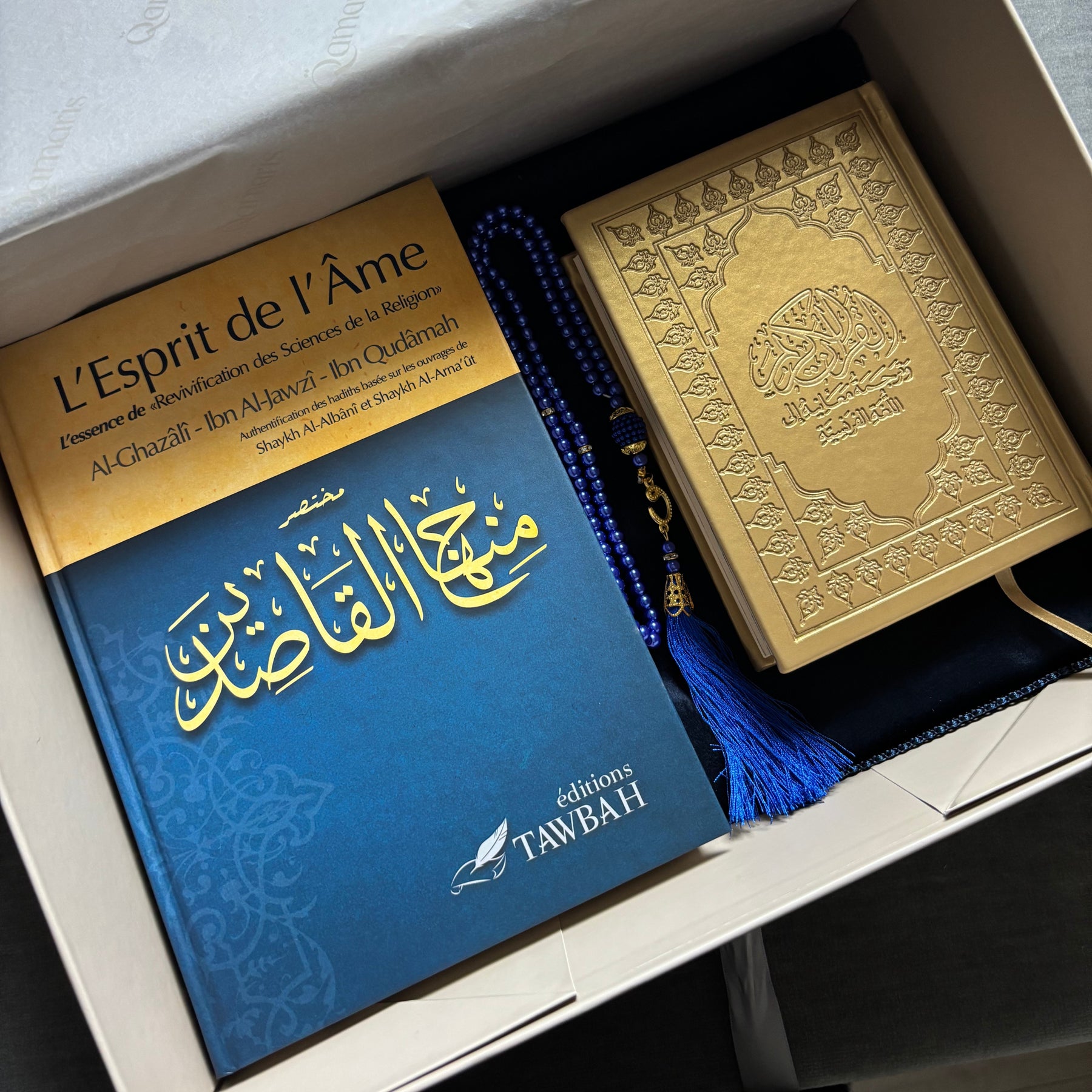 Tapis + Al-Qur’ān + Livre “L’esprit de l’âme” (Éd. Tawbah) + Tasbih + Parfum – 89,90 €