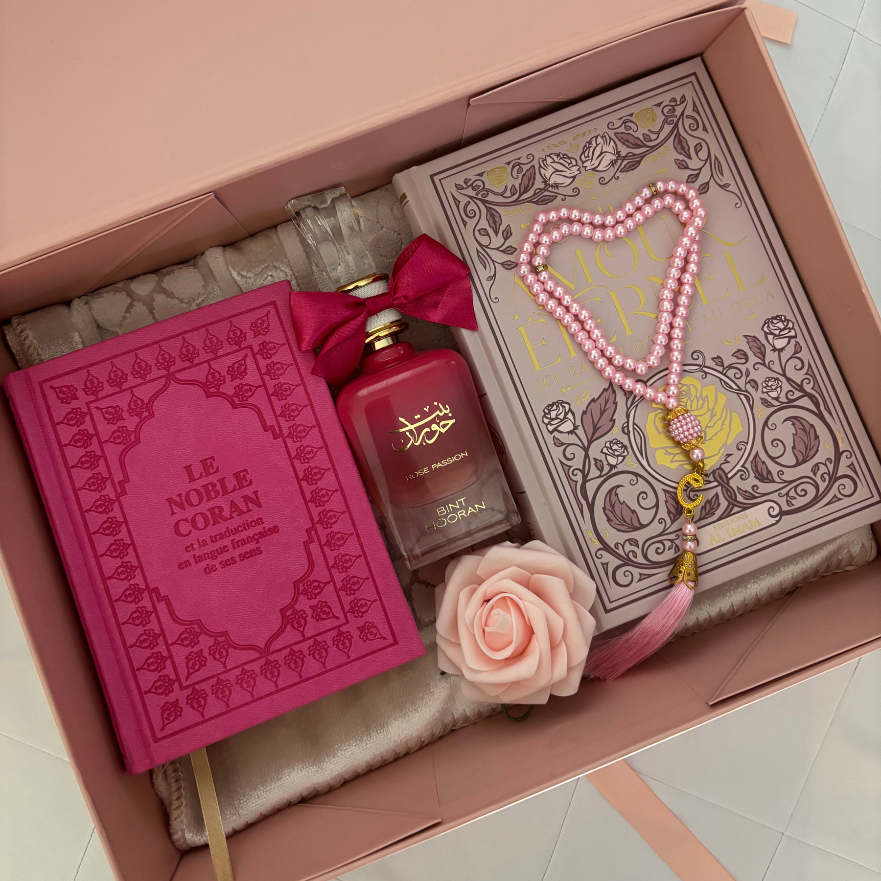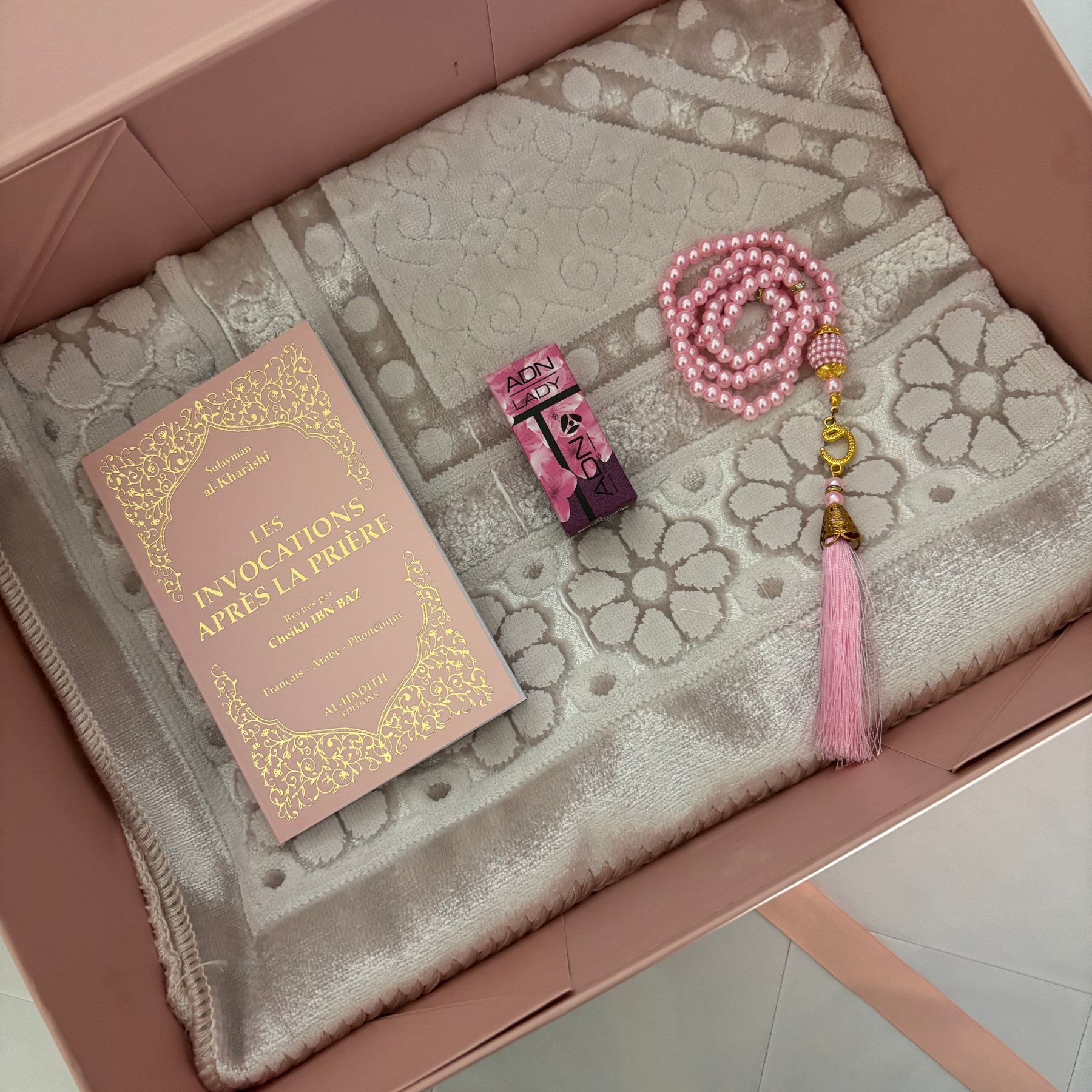 Tapis + Al-Qur’ān + Livre “Pour un Amour Éternel, Ici-Bas et dans l’Au-Delà” + Tasbih + Parfum – 89,90 €