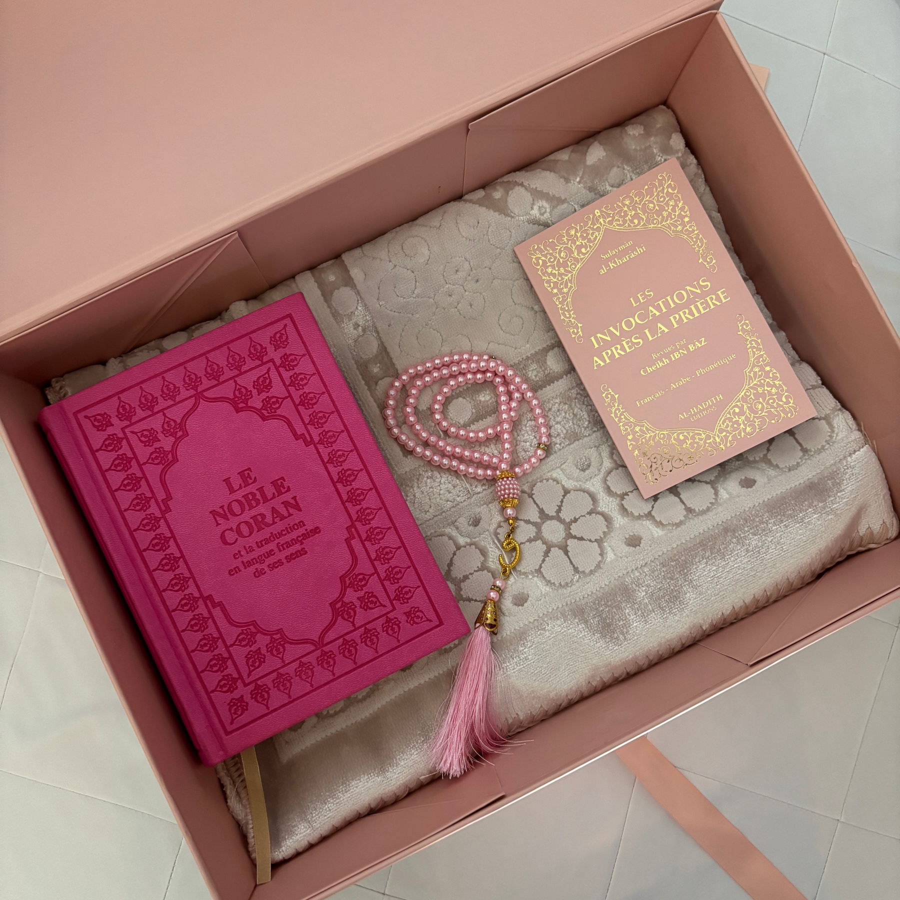 Tapis + Al-Qur’ān + Petit livre + Tasbih – 49,90 €