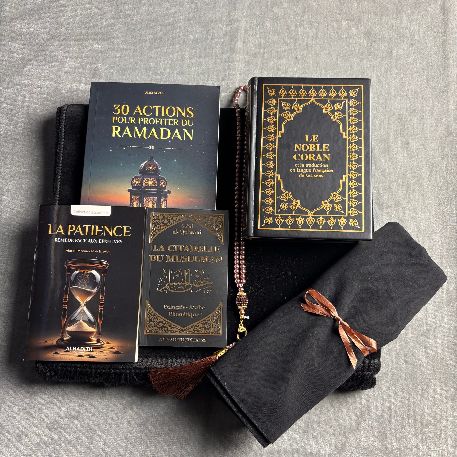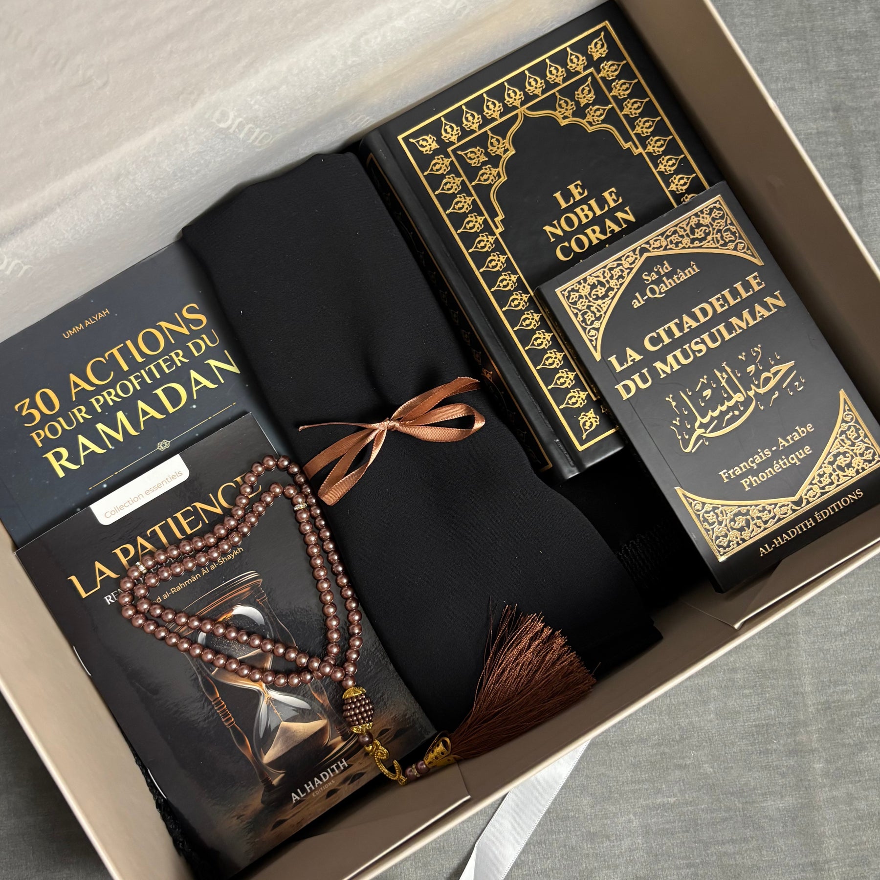 Avec ses tons noirs sobres et raffinés, cette box rassemble l’essentiel pour vivre Ramadan dans les meilleures conditions : lecture, dhikr, purification et organisation.