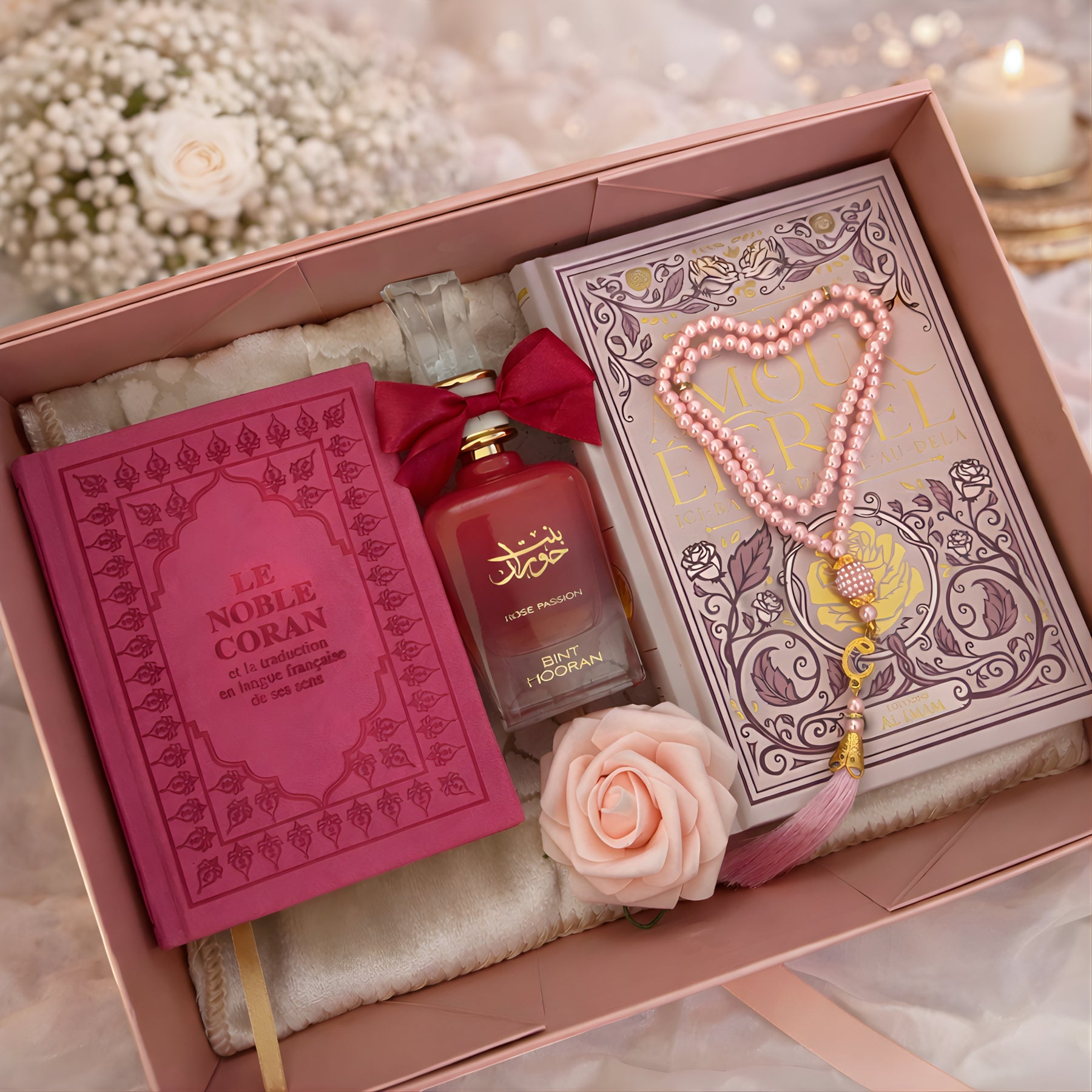 Tapis + Al-Qur’ān + Livre “Pour un Amour Éternel, Ici-Bas et dans l’Au-Delà” + Tasbih + Parfum