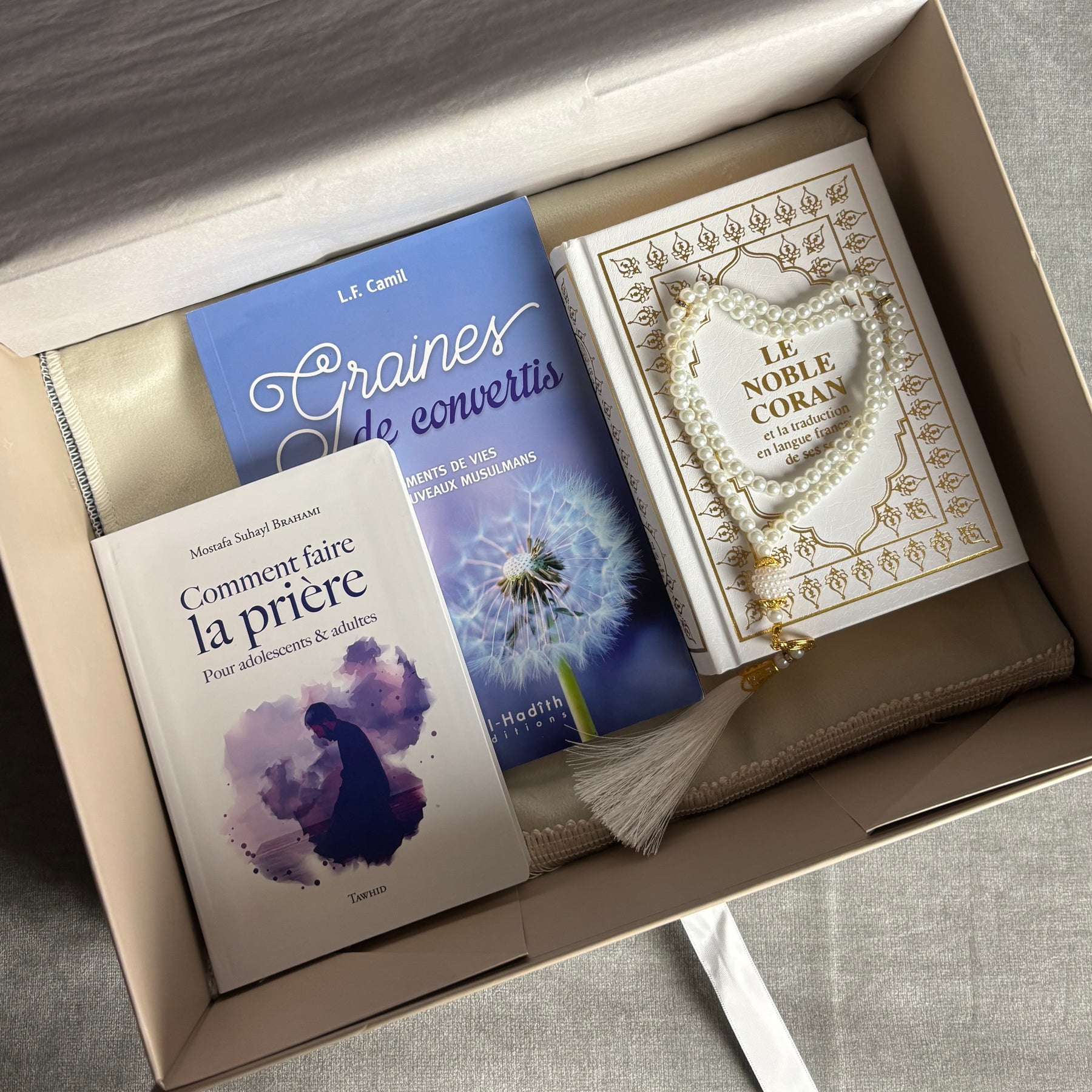 Le Coffret Converti a été imaginée pour accompagner les premiers pas dans l’Islam avec simplicité, bienveillance et profondeur.