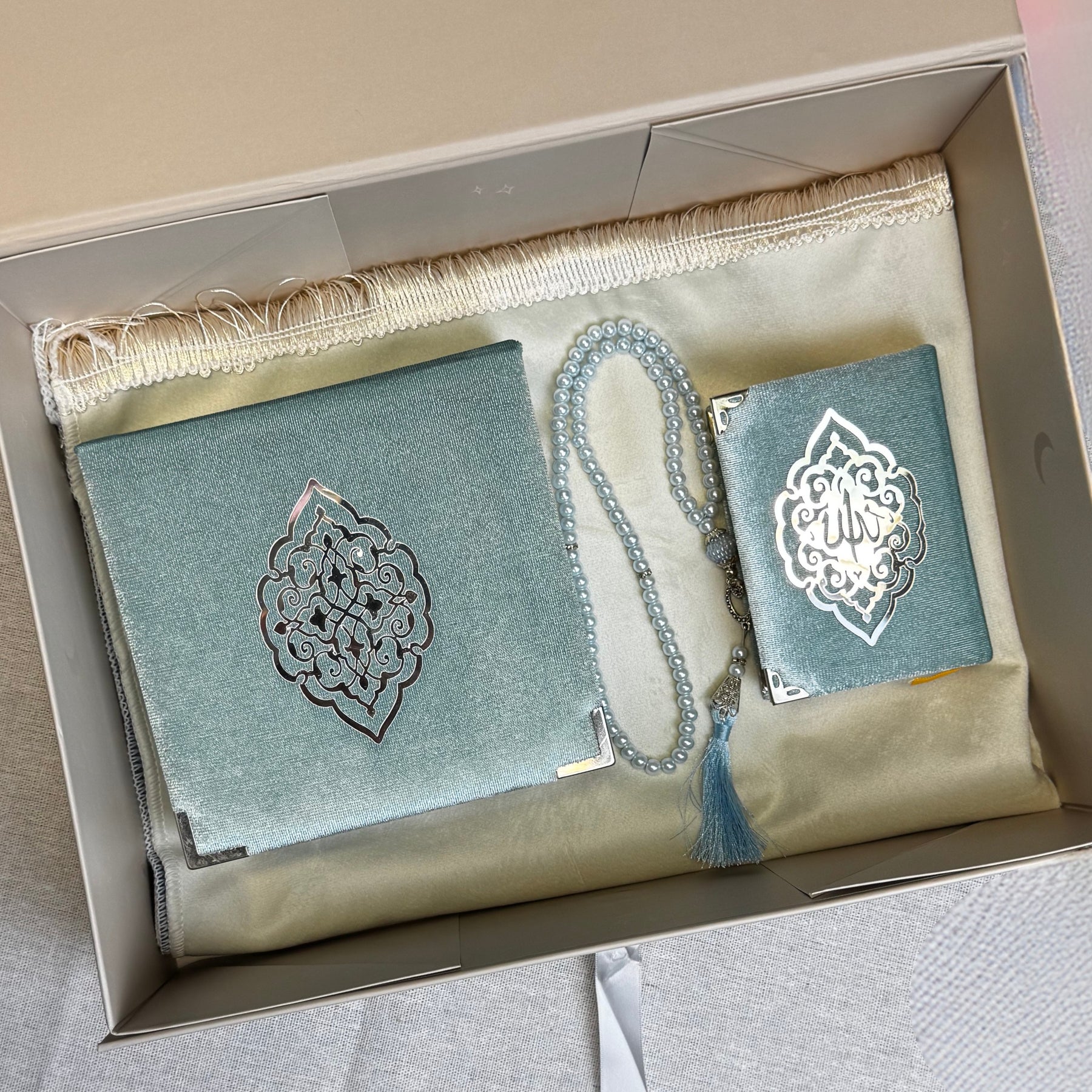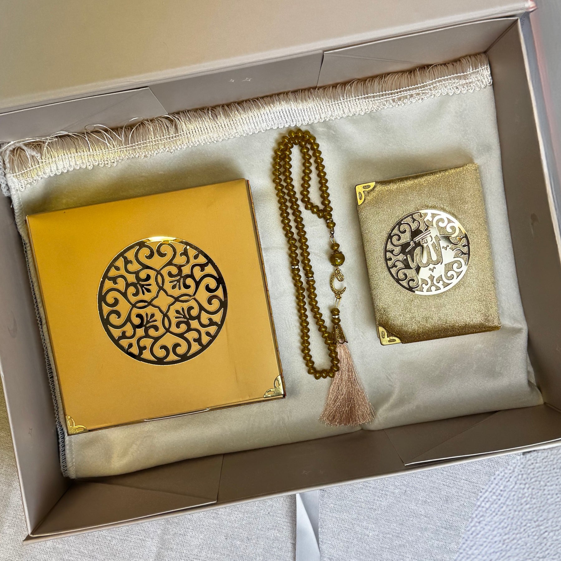 Conçu pour accompagner le croyant au quotidien, ce coffret cadeau islamique minimaliste réunit les indispensables de la pratique : la prière, le rappel et la lecture du Coran.
