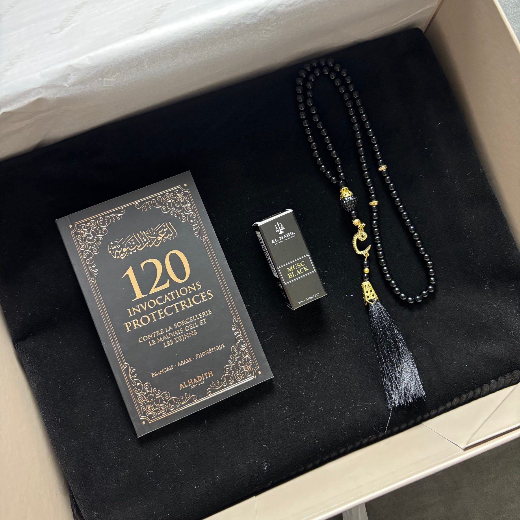 Tapis + Petit livre + Musc + Tasbih – 34,90 €
