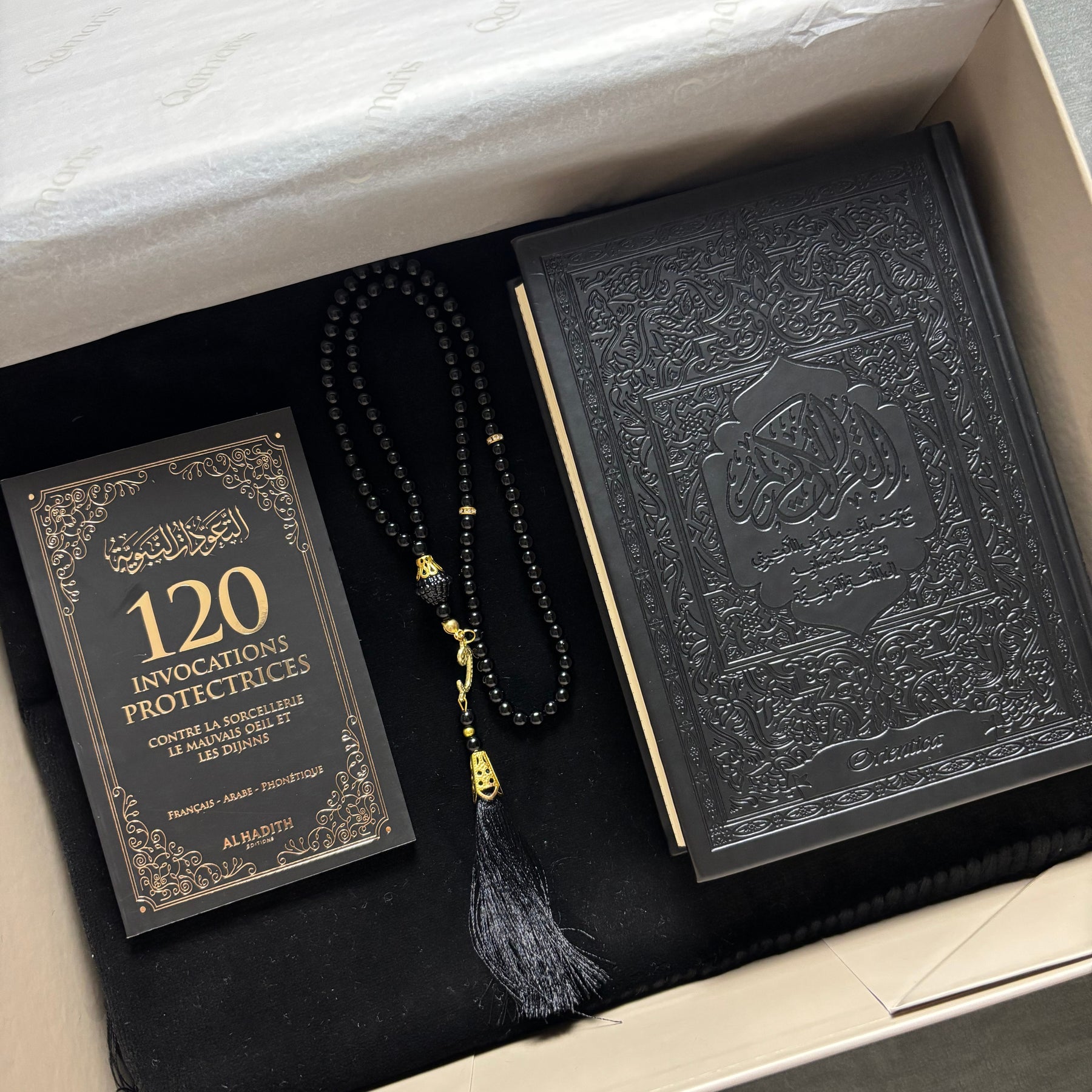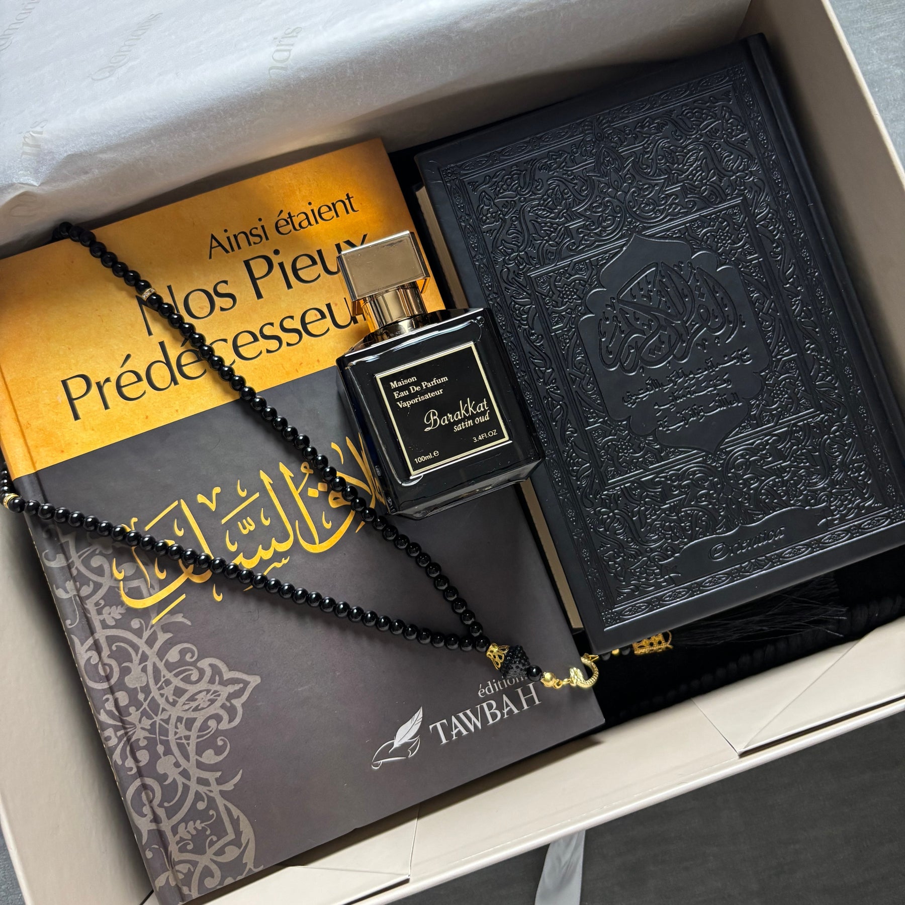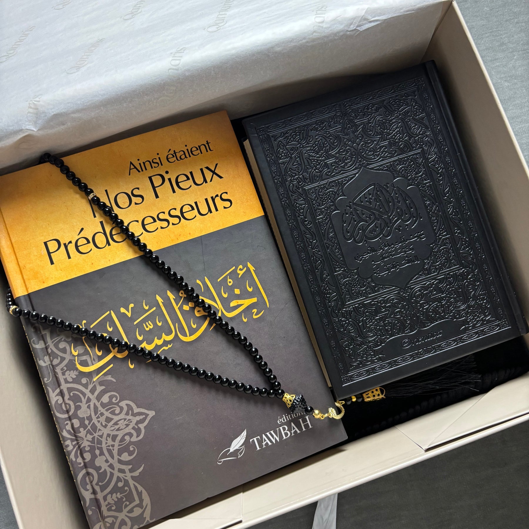 Tapis + Al-Qur’ān + Livre “Ainsi étaient nos pieux prédécesseurs” + Tasbih + Parfum – 89,90 €